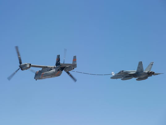 A prototype refueling system was tested in August, 2013 in Texas. In that evaluation, an Osprey equipped with tanks and a refueling hose flew as fighters trailed behind it. The aircraft "safely deployed, held stable, and retracted the refueling drogue as an F/A-18C and an F/A-18D Hornet flew just behind and to the side of the aircraft," Boeing, one of the companies that created the V-22, reported in a news release.